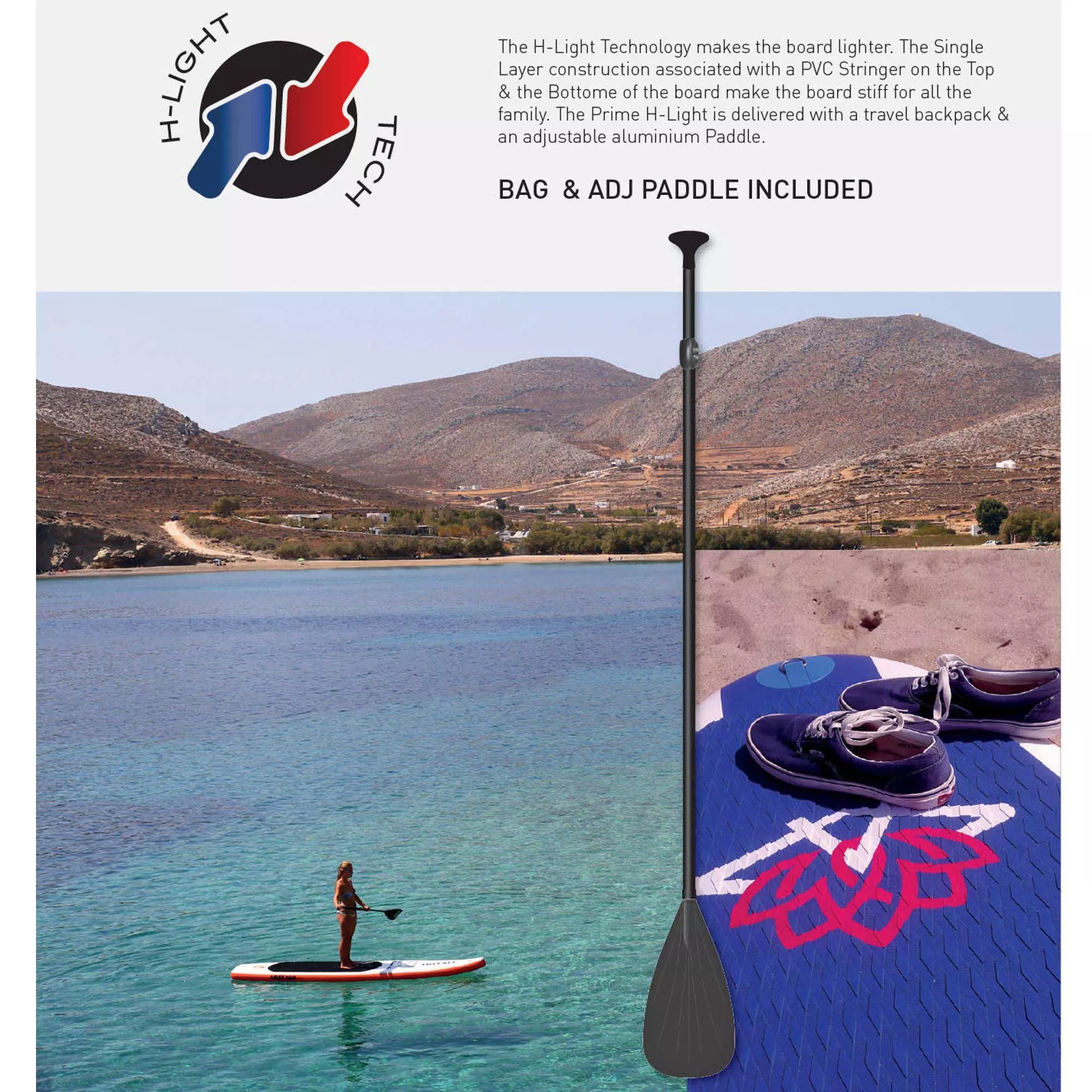 Board mit Finnen, Pumpe, Transportrucksack, Reparaturset, verstellbares Paddel