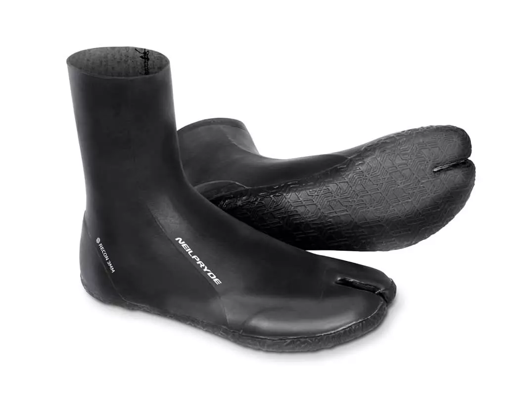 Die NP Recon Sock 3 mm Neoprenschuhe haben einen High-Cut mit einem hohen Schaft, der bis über den Knöchel reicht. Dadurch ist er wärmer und bietet einen sicheren Sitz. Das Anziehen kann durch (Neopren-)Socken erleichtert werden.