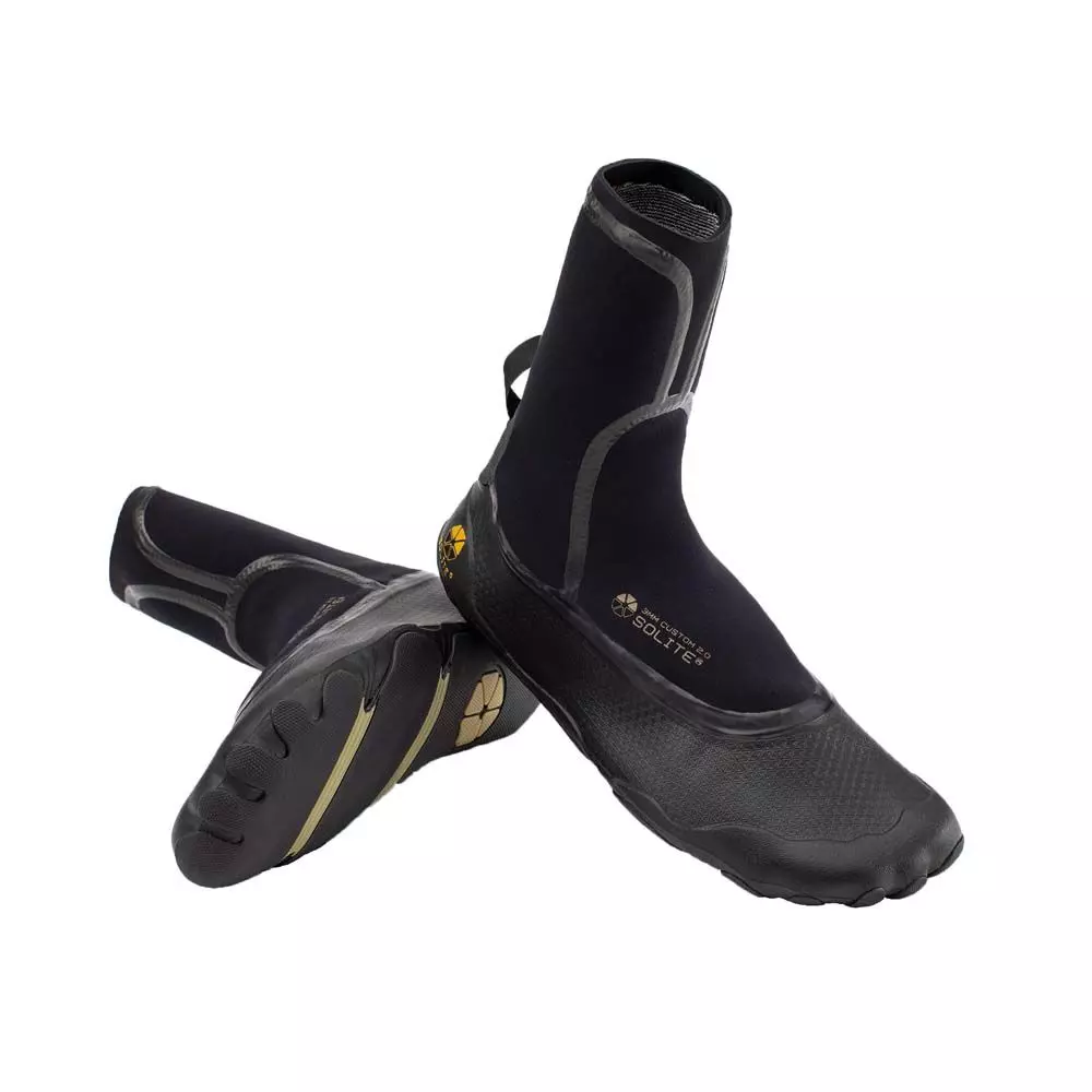 Die Solite 3mm Custom 2.0 Neoprenschuhe haben einen High-Cut mit einem hohen Schaft, der bis über den Knöchel reicht. Dadurch ist er wärmer und bietet einen festen Sitz. Das Anziehen kann durch (Neopren-)Socken erleichtert werden.