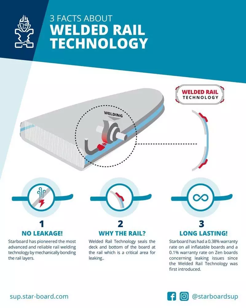 Seit 2019 produziert Starboard alle Inflatables mit laminierten Rails (Kanten). In einer aufwendigen Technologie wird die Ober,- und Unterseite mit den Rails zu einer Einheit verschweißt. Ohne Kleber, denn der hält nicht ewig. Über die Zeit undicht werdende Kanten gehören damit der Vergangenheit an.