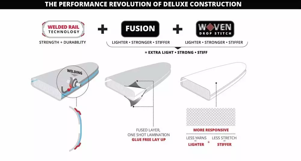 Unser Drop Stich Material ist ab 2020 bei Deluxe Double Chamber und Deluxe Single Chamber gewebt und nicht mehr gestrickt, wodurch es sich nur noch diagonal ausdehnen kann. Dadurch wird weniger Rohmaterial benötigt und eine Ausdehnung ist nur diagonal möglich. Das Ergebnis ist ein deutlich steiferes Board da mehr Druck aufgenommen werden kann. Auch der Verschnitt an Material fällt deutlich geringer aus. Unsere Woven Technology verbessert unsere aufblasbaren Boards in jeder Hinsicht. Weniger Gewicht, bessere Beschleunigung, einfacher zu transportieren.